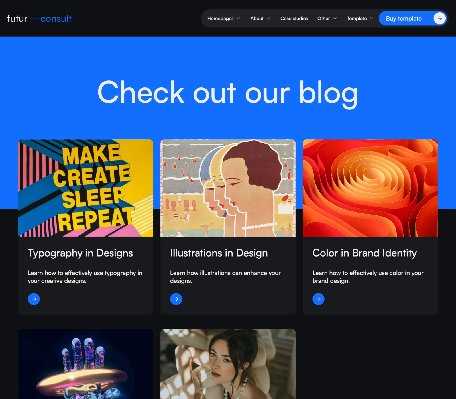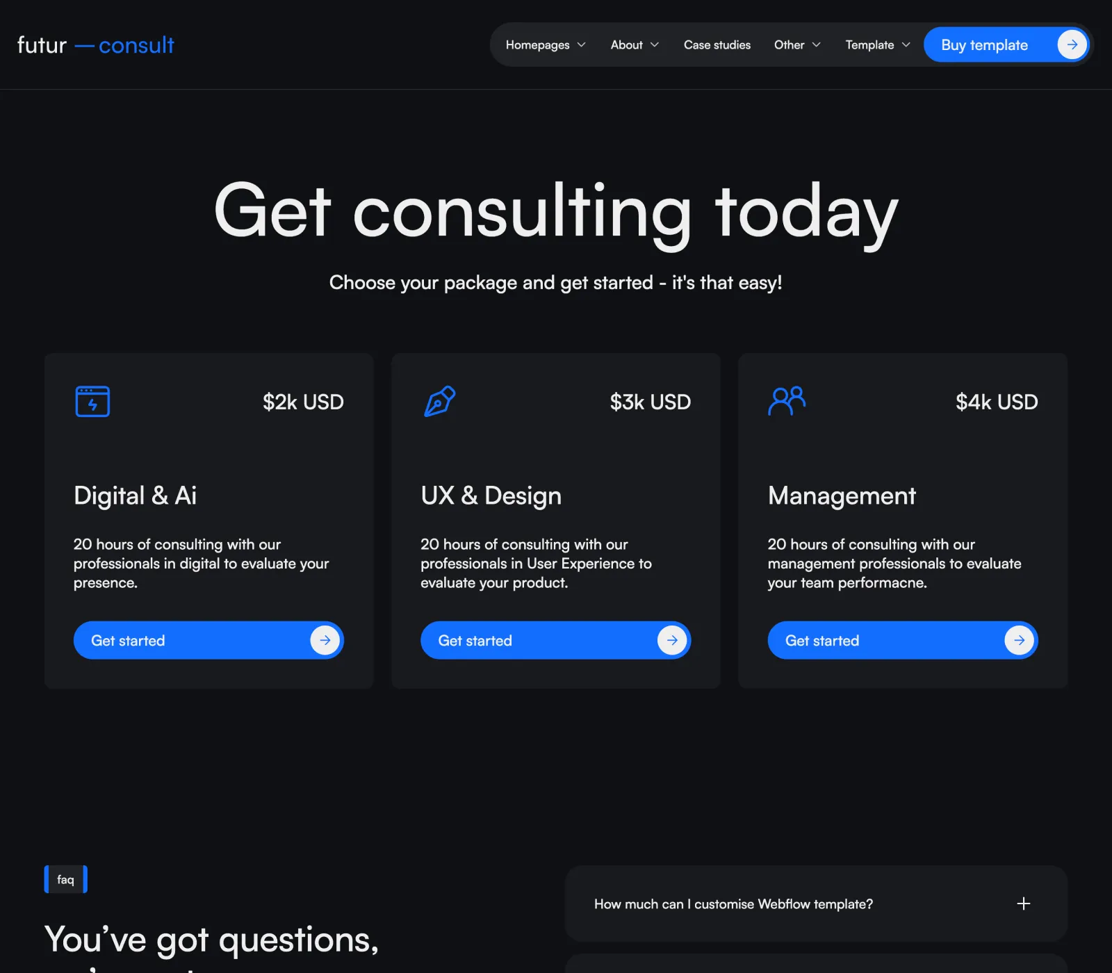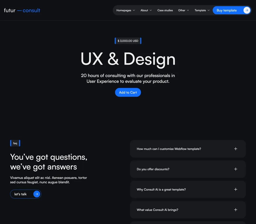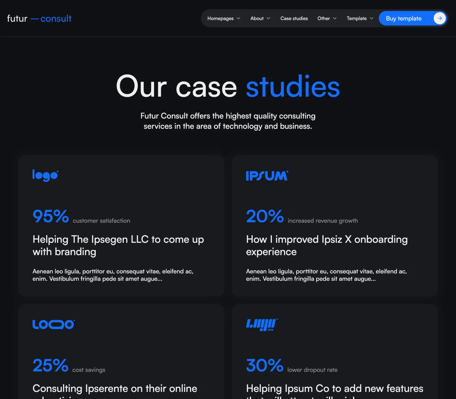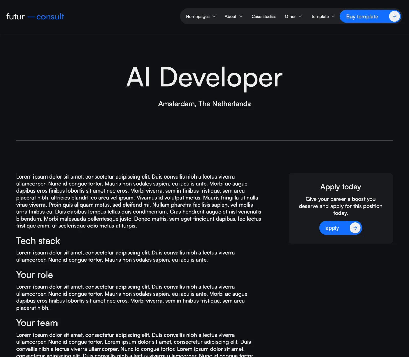 Futur Consult includes a blog, careers and case studies collections that are made on the powerful Webflow CMS. This will let you add new content extremely easily.